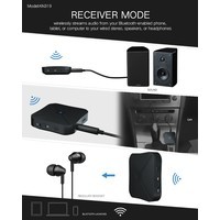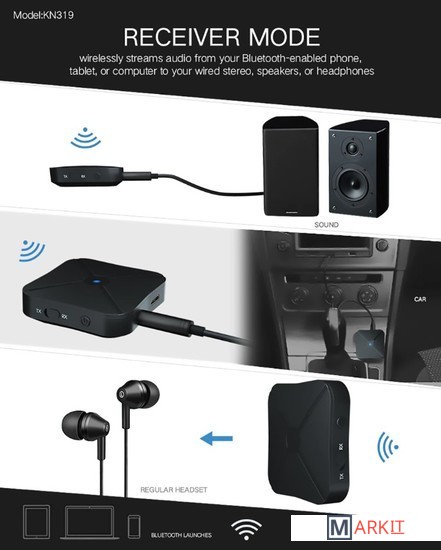Портативный и легкий беспроводной аудио передатчик и приемник – идеальное решение для широкого спектра задач. Совместим со многими устройствами, например, компьютер, ноутбук, домашний кинотеатр, наушники, смартфон, mp3-плеер, CD-плеер и т.п.Режим передатчика (TX – красный диод): обеспечивает беспроводную передачу аудио с телевизора без Bluetooth, домашнего кинотеатра или CD-плеера на Bluetooth наушники или колонки.Режим приемника (RX – синий диод): обеспечивает беспроводную передачу аудио с телефона, планшета или компьютера с поддержкой Bluetooth на проводные колонки или наушники.Для переключения между режимами передатчика и приемника используется переключатель TX/RX. Прост в подключении: по технологии Bluetooth и кабелю jack 3.5mm. Имеет встроенный аккумулятор и заряжается от порта USB.Характеристики:- рабочий диапазон: до 10 м (без каких-либо блокирующих объектов);- время зарядки: 2 часа;- время непрерывного использования: 6 часов (режим приемника) / 5 часов (режим передатчика);- тип батареи: литий-полимерный (200 мАч);Комплектация:- беспроводной аудио адаптер Bluetooth v4.2 RX/TX – 1шт;- кабель питания MicroUSB – 1шт;- RCA кабель – 1шт;- кабель jack 3.5mm (AUX);- руководство пользователя.