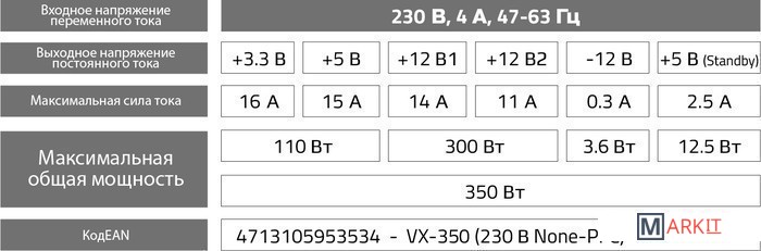 | Комбинированная нагрузка по +12V | 300 Вт |