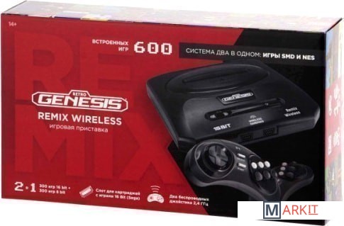Игровая приставка Retro Genesis Remix Wireless с поддержкой сразу двух платформ – 8 и 16 бит – позволяет играть в игры типа NES (Famicom/Dendy) и Sega. Встроенные 600 игр, из которых 300 игр 8 бит и 300 игр 16 бит, предлагают широкий спектр развлечений, в числе которых увлекательные игры про Марио, Танчики и Соника. Приставка оснащается классическим AV-разъемом. В комплект с приставкой идут два проводных джойстика в привычной форме геймпадов Sega с шестью кнопками действия.За счет того, что в приставке используется не эмулятор, а полноценный аналог оригинального железа классических приставок NES и Mega Drive, игры идут в полноценных 50 и 60 герцах (в зависимости от игры). Это обеспечивает плавную картинку и отсутствие задержек в играх. Кроме этого запуск и перезагрузка приставки происходят моментально.Классический полноразмерный корпус MD2, выполненный из высококачественного ABS пластика, и качественные джойстики делают модель приставки прекрасным подарком для различных возрастных групп: как для детей, так и для взрослых. Для совместного прохождения из списка встроенных игр подходят около двух сотен увлекательных красочных игр разного уровня сложности.Преимущества:- Полноценное воспроизведение игр за счет использования аналога оригинального железа классических приставок – никаких эмуляторов.- Система два в одном: игры SMD и NES.- 600 встроенных игр: из них 600 игр SMD и 300 игр NES. Игры не повторяются, не являются клонами самих себя или разными уровнями одной и той же игры.- Слот для картриджей с играми 16 Bit. Позволяет запускать игровые картриджи «Sega».- Увеличенная совместимость за счет двух переключателей регионов: J/O и N/P.- Раздельные каталоги игр на 16 и 8 бит, ранжированные по алфавиту.- Два беспроводных джойстика в комплекте.!!! Рекомендуется для подключения к классическим ЭЛТ-телевизорам с разрешением SD.