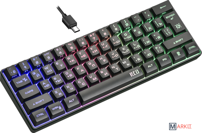 Компактная конструкция экономит пространство рабочего столаОтключаемый кабель с разъемом Type СКабель можно отключить для удобства переноски клавиатурыСпециальные игровые функции: блокировка системных клавиш Windows и переключение стрелок курсора на кнопки WASD**Блокировка системных клавиш: нажмите и удерживайте клавишу Fn, затем нажмите клавишу Windows - системные клавиши заблокируются. Чтобы разблокировать клавиши, повторите действие. Переключение клавиш W, A, S, D в игровой режим. Нажмите и удерживайте_ Fn, одновременно нажмите_W. Клавиши W, A, S, D переходят в режим стрелок, [↑][←] [↓] [→] соответственноФункция Anti-ghost23 клавиши: Q, A, Z, W, S, X, E, D, C, B, F, T, Y, U, 4, 6, 0, BACK, ], ENTER, /?, Space, TabРадужная подсветкаДля смены режима подсветки используйте комбинацию клавиш "FN+K"Возможность выключения подсветкиКнопки FN+I для включения и выключения подсветкиРегулируемая яркость подсветкиИспользуйте комбинацию клавиш "FN + O" для усиления и комбинацию "FN + L" для снижения яркости подсветкиПовышенная износостойкостьУправление скоростью динамической подсветки FN+стрелки влево/вправо
