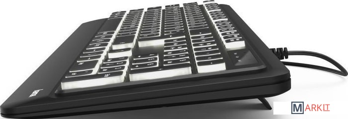 Клавиатура HAMA KC-550 подключается через разъем USB. Отличается удобной подсветкой клавиш, которая позволяет комфортно работать по ночам, не мешая отдыхать близким. Провод достаточно длинный, имеется удобная направляющая для него, в которую он укладывается и не мешает процессу работы. Для удобства пользователя есть специальные приспособления, позволяющие менять угол наклона устройства, достигая самого комфортного состояния. Устройство имеет квадратные, приятные на ощупь и легкие в нажиме клавиши. Расположены они в классическом порядке, хорошо разделены. Клавиатура HAMA KC-550 создана в классическом стиле, имеет черный цвет с приятной белой подсветкой. Буквы на раскладках английской и русской нанесены белой краской.