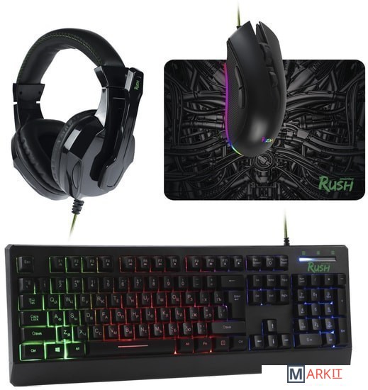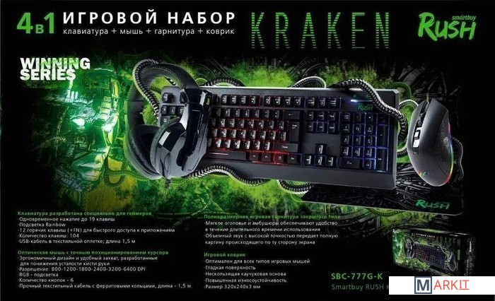 Проводной набор клавиатура + мышь + коврик + гарнитура SBC-777G-K Rush Kraken Smartbuy.
