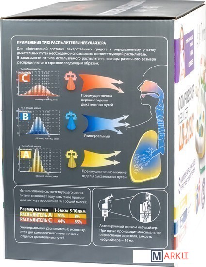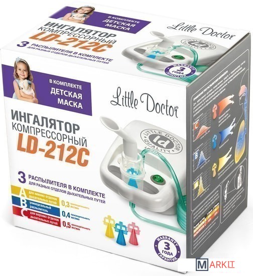 Модель LD-212C является незаменимым помощником при лечении заболеваний дыхательных путей для широкого круга потребителей, как в домашних условиях, так и в лечебных учреждениях различного профиля.Особенностью компрессорных ингаляторов Little Doctor является комплектация тремя распылителями, обеспечивающими различный спектр частиц аэрозоля, что позволяет добиться максимального эффекта от лечения и при этом экономно расходовать лекарства. Терапевтический эффект достигается избирательным воздействием лекарственных препаратов на ту или иную область дыхательных путей благодаря специальной конструкции каждого распылителя.У ингалятора LD212C пониженный уровень шума во время процедуры ингаляции.В комплектацию ингалятора входят: две маски (взрослая и детская), два мундштука, две насадки для ингаляции через нос, ингаляционная трубка длиной два метра, пять сменных фильтров.Особенности:• Три распылителя для воздействия на разные отделы дыхательных путей• Активируется вдохом• Малошумный компрессор• Компактный размер• Объем резервуара 10 мл• 20 мин беспрерывной работы