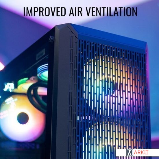Этот высокопроизводительный корпус формата Mid-Tower создан с учетом вентиляции и предоставляет качественный воздушный поток, пока вы наслаждаетесь подсветкой вентиляторов на передней панели. Боковая панель из закалённого стекла позволяет рассмотреть все компоненты системы. Два дополнительных слота расширения дают возможность установки видеокарты в вертикальном положении.Вентиляционные отверстия на передней панели увеличивают поток воздуха и улучшают вентиляцию, обеспечивая превосходное охлаждениеБоковая панель из закаленного стекла для демонстрации внутренней части системыДва дополнительных слота расширения дают возможность установки видеокарты в вертикальном положенииКрепления для вентиляторов на отсеке для блока питания позволяют установить до 2 х120 мм вентиляторов, которые обеспечивают дополнительное охлаждение видеокартыПоддерживает жидкостное охлаждение в передней, верхней и задней части корпусаМаксимальная высота системы охлаждения процессора – 160 ммПоддержка видеокарт премиум-класса длиной до 343 мм (без переднего радиатора)