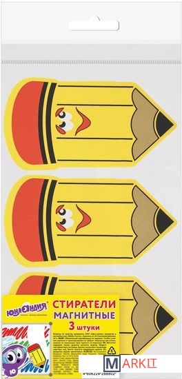 Стиратели магнитные ЮНЛАНДИЯ предназначены для стирания сухим способом надписей, сделанных маркером, с белых досок.Встроенный магнит позволяет расположить стиратель в любом месте рабочей поверхности доски. Стиратель имеет эргономичную форму и необычный яркий дизайн. Размер — 55х100 мм. Стирающий слой выполнен из фетра. Поставляется в упаковке с европодвесом. В комплекте 3 желтых стирателя с рисунком. Внимание: стирать надписи с доски рекомендуется лёгкими круговыми движениями.