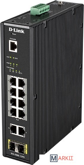 Управляемый коммутатор DIS-200G-12PS, оснащенный 10 портами 10/100/1000Base-T (8 портов поддерживают Power over Ethernet (PoE)), а также 2 портами 1000Base-X SFP, которые используются для организации подключения к высокоскоростной магистрали, предназначен для применения в сетях промышленных предприятий. DIS-200G-12PS поддерживает технологию D-Link Green и расширенные функции управления и безопасности. Функции управления включают SNMP, управление на основе Web-интерфейса, утилиту D-Link Network Assistant и интерфейс командной строки (CLI).